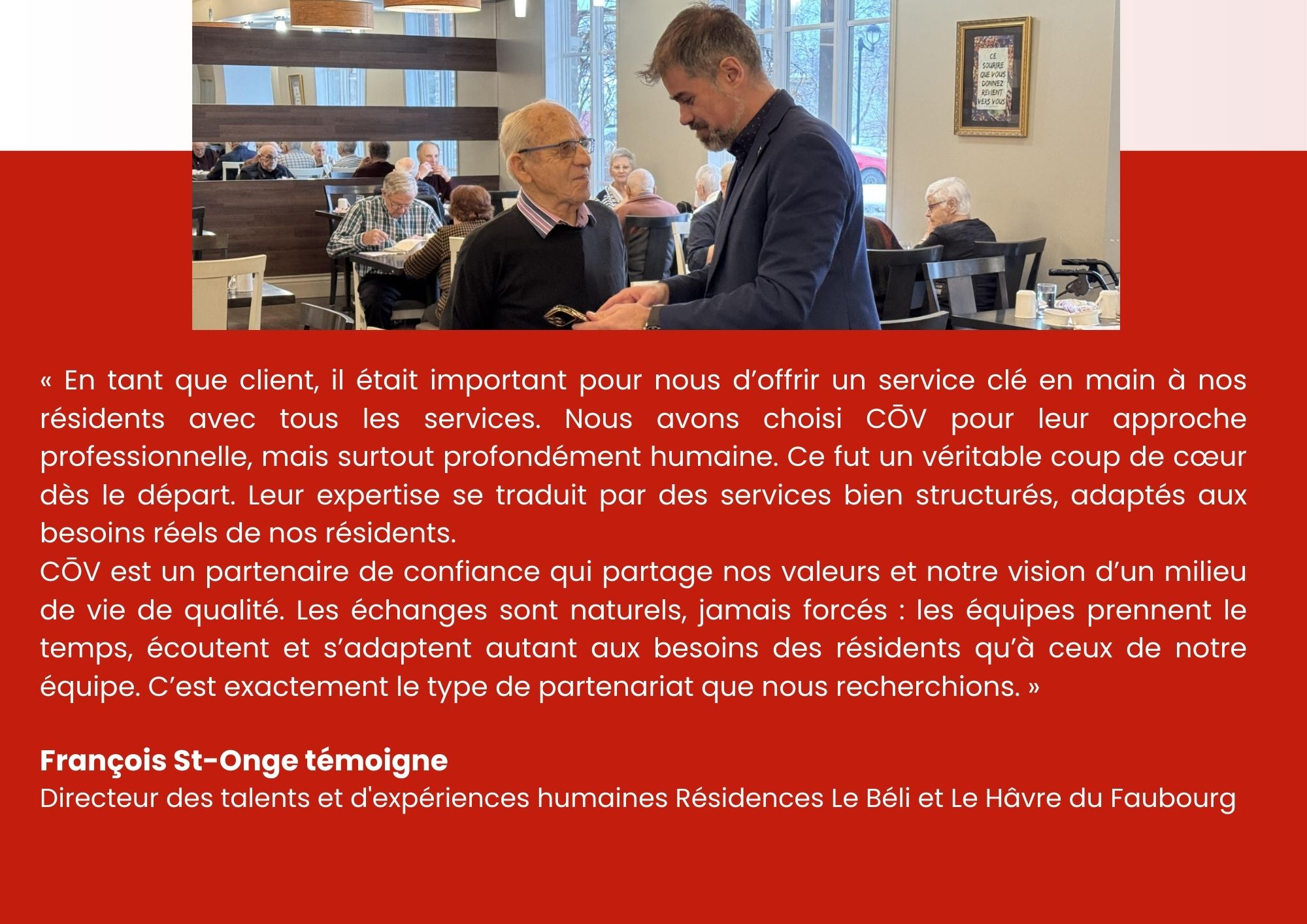 « J’étais un jeune retraité issu de la direction d’une des grandes entreprises de télécommunication québécoises quand j’ai découvert CŌV. J’ai voulu rejoindre l’équipe pour participer à ce projet humain porteur d’avenir, avec des solutions adaptées aux réalités des aînés », raconte-t-il.