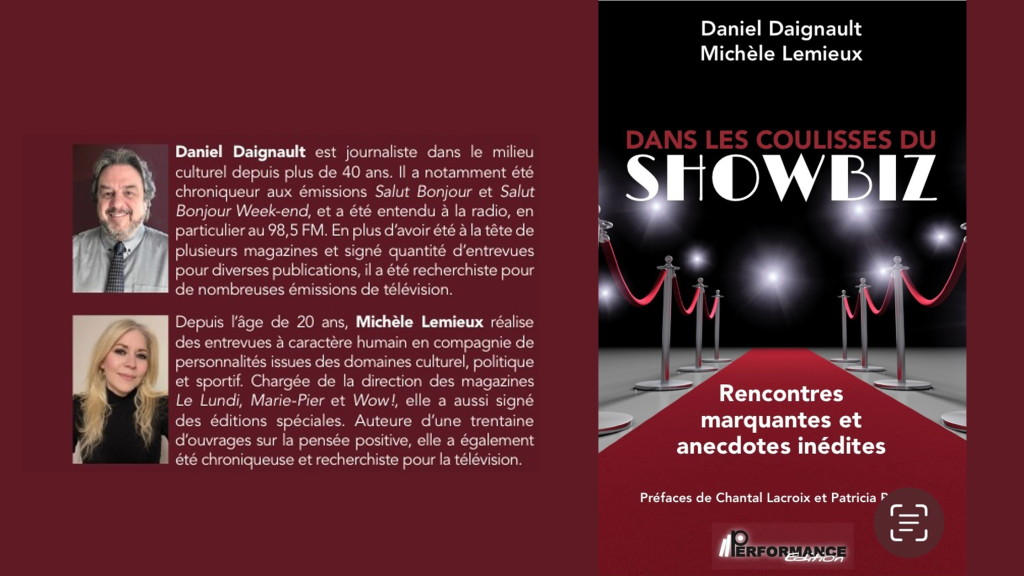 C’est précisément ce fil que déroulent les journalistes Daniel Daignault et Michèle Lemieux dans leur nouvel ouvrage, Dans les coulisses du showbiz, publié chez Performance Édition. En librairie le 18 mars 2026, ce livre de 225 pages rassemble plus de trente-cinq ans de rencontres, d’entrevues et de moments parfois improbables vécus au cœur du milieu culturel.