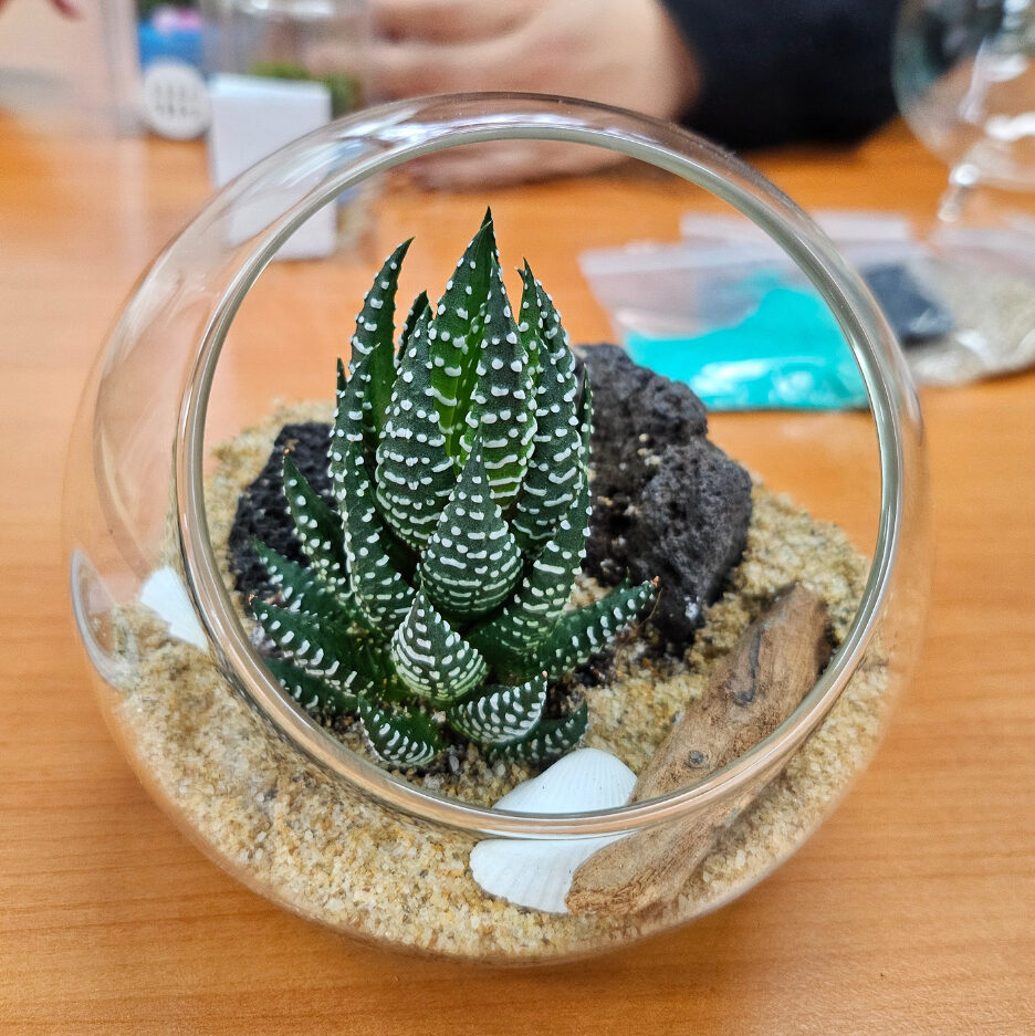 En utilisant un contenant en verre ouvert ou fermé (bocal, lanterne, cloche, vase large) il est possible de créer un mini jardin. Combinez sable, gravier, terre spéciale cactus et quelques spécimens de petite taille. Ajoutez quelques pierres décoratives, coquillages ou figurines pour personnaliser l’ensemble et votre terrarium égaiera votre intérieur.